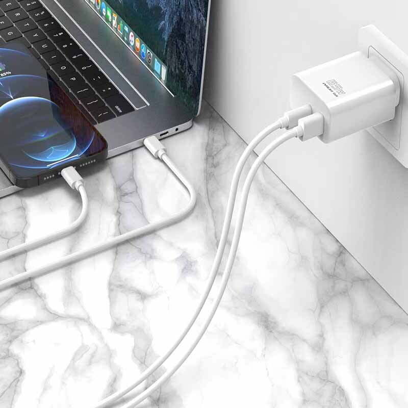 Our dual port GaN wall charger is USB-C PD 3.0 certified, delivering a safe and powerful charge to your compatible device. Get charging speeds of 0-50% in 25 minutes for an iPhone 14 or 0-50% in 26 minutes for a Samsung Galaxy S21 Ultra 5G.